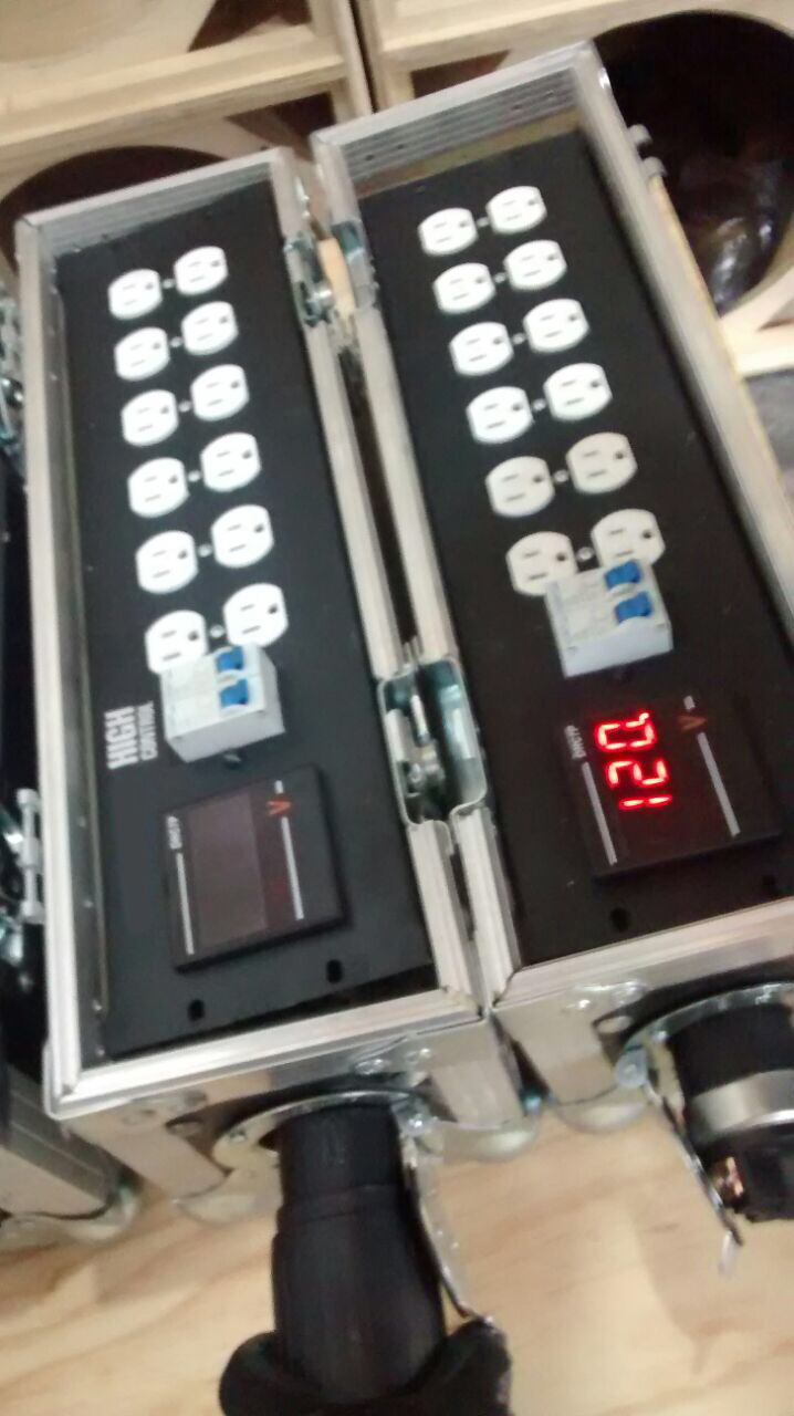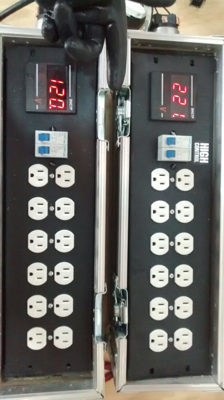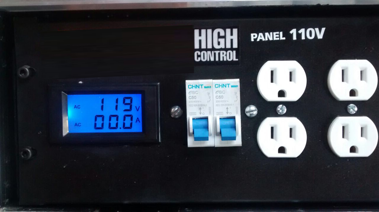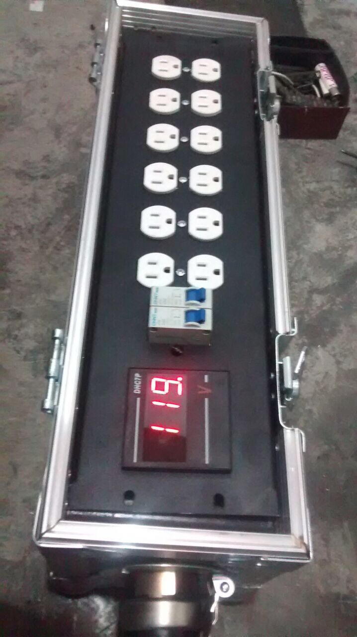 Centro de carga de facil transporte, separado en dos secciones induviudales (las cuales pueden separarse en dos piezas y usarse en dos lugares distintos) con 12 contactos cada uno, con sus dos pastillas de 50A cada una, y un monitor de voltaje y consumo de ampers. (En total 24 contactos 110)